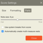 Premium users have long had the ability to manually create multi-measure rests in Noteflight for display in individual parts of a score. Now Premium Noteflight users can automatically create multi-measure rests, whenever a single part is viewed from a larger score. Just open the Score Settings panel, go to the Parts tab and check “Automatically create multi-measure rests”. Once this box is checked, Noteflight will automatically put in multi-measure rests to fill sequences of measures as needed, whenever a single part is viewed. Rests will break for repeat endings and signs, double bars, codas, and other symbols that are important to include in the part. Users may still use manual multi-rests as well.